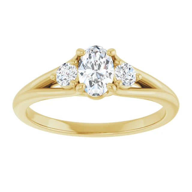 Introducing The Elowen™ Setting—a refined take on the classic three-stone ring, where symbolism and craftsmanship are seamlessly intertwined. At its center lies a brilliant lab-grown oval-cut diamond, flanked by two sparkling side stones representing your past, present, and future. Beneath the trio, a graceful woven gallery of yellow gold cradles the stones—an intricate design element that evokes strength, unity, and the beauty of connection.